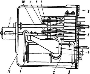 коромысла 3 и тяги 5 управляет контактной системой 6. В реле имеются упорные