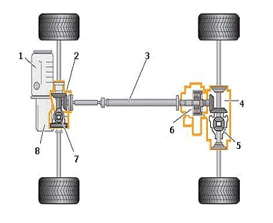 Коробка передач; 3. Межосевой дифференциал; 4. Карданная передача задней оси;