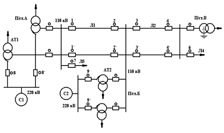 а) принципиальная схема распределительной сети 110кВ;