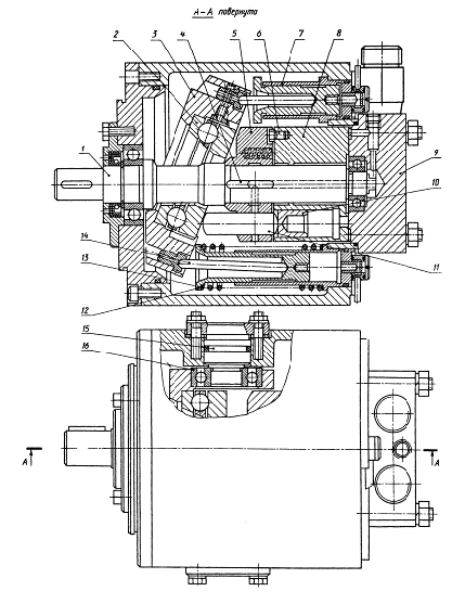 представляет собой роторную аксиально-плунжерную машину с наклонным опорным