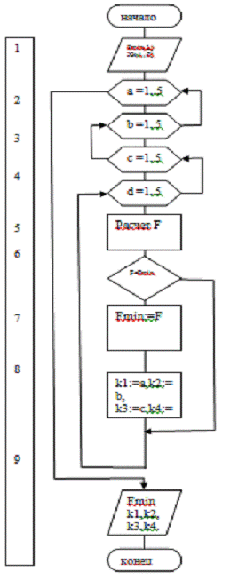ввода. Вводим значение Fmin (заранее больше ожидаемого результата),Lj, Xk,i ,
