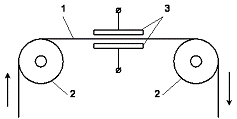 Контролируемый материал 1 протягивается с помощью роликов 2 между обкладками