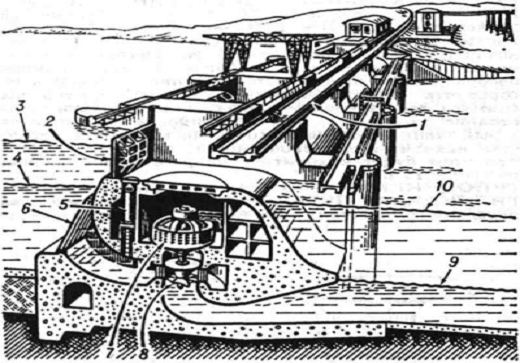 гидравлическая турбина; 9 - минимальный уровень нижнего бьефа; 10 -