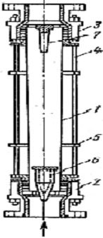 при нулевом расходе жидкости или газа. Верхний патрубок 3 снабжен ограничителем