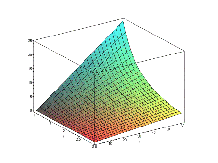 >restart;h:=4*t*mu^2/(9.8*ro^2*s^2);mu:=1;ro:=0.99;plot3d(h,s=1..3,t=0..60);