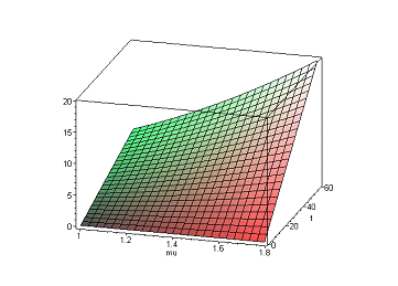 >restart;h:=4*t*mu^2/(9.8*ro^2*s^2);s:=2;ro:=0.99;plot3d(h,mu=1..1.792,t=0..60);