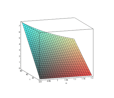 >restart;h:=4*t*mu^2/(9.8*ro^2*s^2);mu:=1;s:=2;plot3d(h,ro=0.9..1.2,t=0..60);