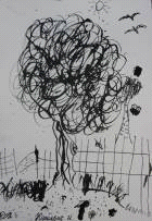 на заднем плане можно увидеть очертания домов, забор. Перед деревом нарисована