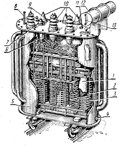 низшего напряжения; 13 - маслоуказатель;11- пробка для заливки масла; 12 -