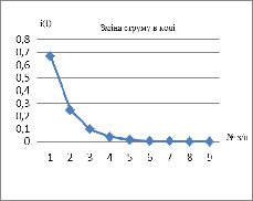 вхідної дії струм в колі спадає від 0,67 А до нуля;