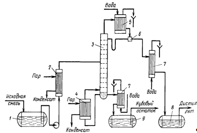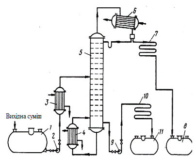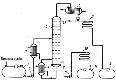 - теплообмінник-підігрівач; 4 - кип’ятильник; 5 - ректифікаційна колона; 6 -