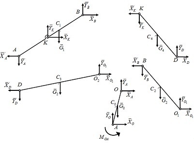 шарнирный механизм по шарнирам на отдельные звенья и изобразим реакции внешних