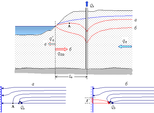 Рис. 7.2. Балансово-гидродинамические схемы работы водозабора у