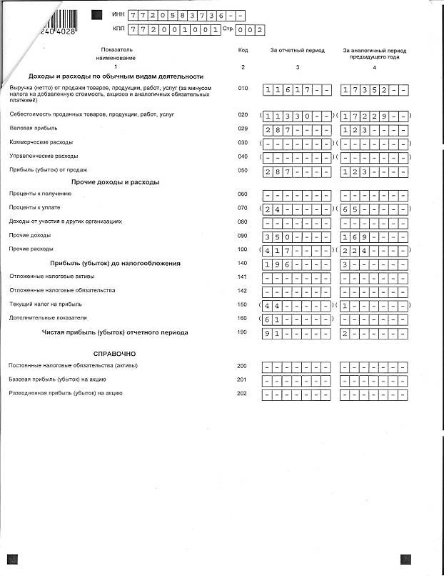 по форме бухгалтерской отчетности №2 «Отчет о прибылях и убытках»