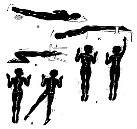 ноги в сторону на стороне выпуклости (при поясничном сколиозе); вытягивание