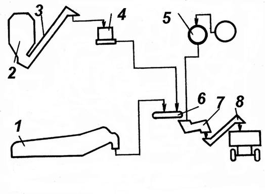 - накопитель-питатель грубых кормов; 2 - транспортер; 3 - бункер сухих