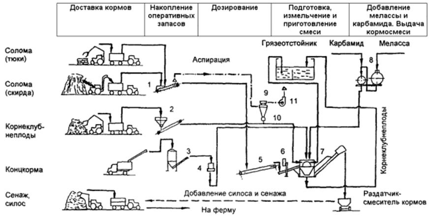 для мойки, дозирования корнеклубнеплодов и приготовления кормосмесей; 8 -