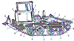 лебедки; 10 - блок заднего моста; 11 - ведущие колесо; 12 - гусеничная цепь; 13