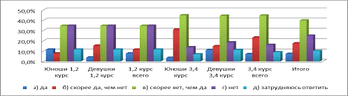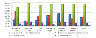 на 1,2 курсе и 10,3% на 3,4 курсах, у девушек 19,2% на 1,2 курсах и 3,7% на 3,4