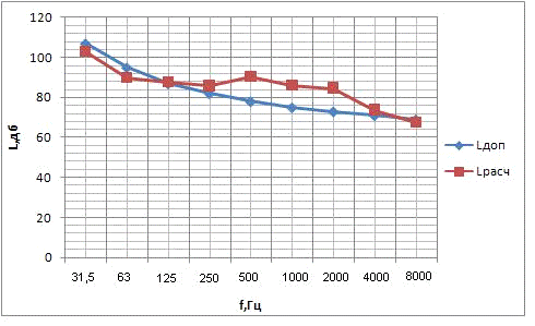 на частоте 31,5 Гц происходит превышение допустимого уровня звукового давления.