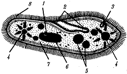 мембрана; 2 - цитоплазма; 3 - ендоплазматична сітка; 4 - війки; 5 - ядро; 6 -