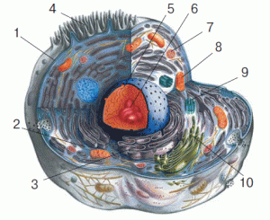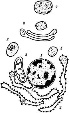ядерце; 7 - лізосома; 8 - мітохондрія; 9 - центросома; 10 - апарат Гольджі