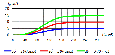 базою та емітером Uбе змінюємо в межах від 0,5 до 1 В через кожні 50