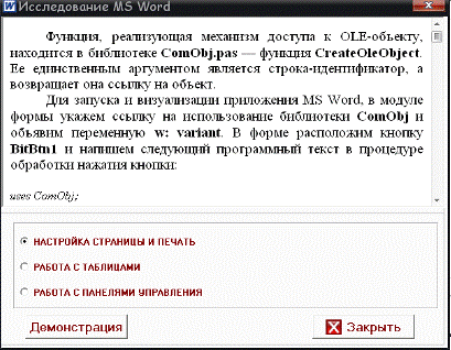наглядно проиллюстрировать возможности управления приложениями MS Office с помощью программ, написанных в среде Delphi. Система базируется на использовании