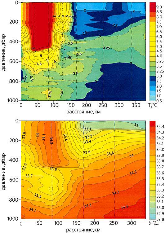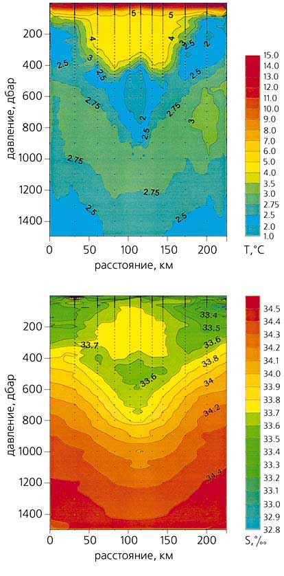 соленым. На рисунках внизу видно, что вихрь содержит мощное теплое и соленое