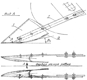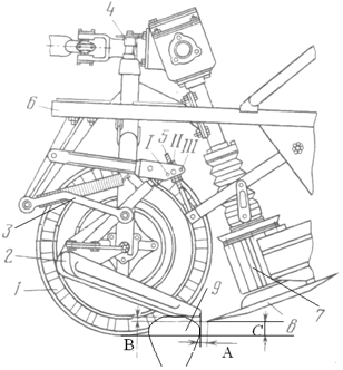 спирається на опорний коток, розпушувальної лапи, ротора і коритоподібного