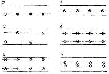 в-двухрядная прямоугольная; г - осевая; д - двухрядная прямоугольная по осям