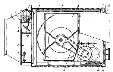 обводной канал; 4 - поворотная ось; 5 - всасывающий патрубок; 6 - жалюзи; 7 -