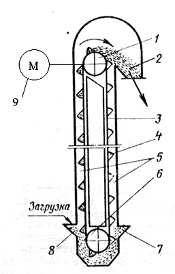 патрубок; 3 - стрічка; 4 - ківш; 5 - труба; 6 - натяжний барабан; 7,8 -