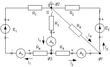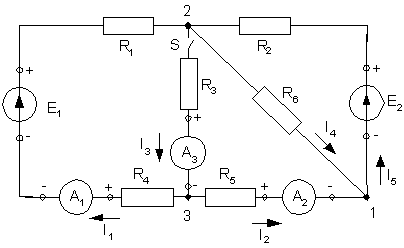 2) При замкнутом ключе S измеряем токи от действия обеих ЭДС, полученные значения заносим в