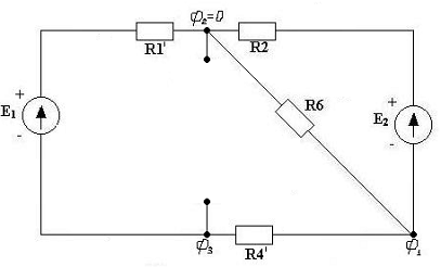 потенциалы всех узлов, обозначенных на схеме: