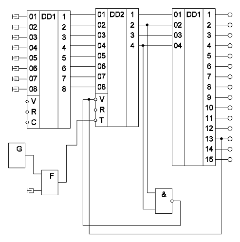 двоичного числа из счётчика, эта же 1 поступает на DD12.2, который при приходе