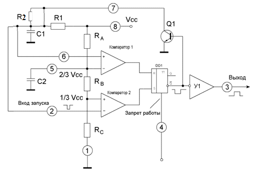 Основой таймера 555 является RS-триггер, управляемый двумя