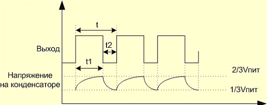2/3 Vcc. Времязадающую цепочку образуют навесные элементы R1 и С1. С подачей