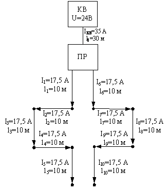 участков общей длиной 130 м. Токораспределительную сеть будем запитывать от КВ,