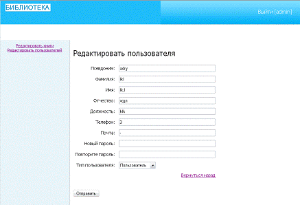 учетными записями пользователями и картами книг. Администратор может изменять,