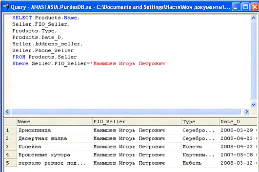Задание: Для заданного продавца выдать список всех изделий,