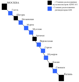 Москва - Казань построена на основе оптических мультиплексоров ADM 4/1 и ADM 16/1 американской компании Lucent Technologies. Схема расположения оборудования (SDH) приведена на рисунке 1.3.