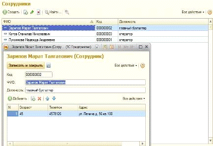 справочник «Сотрудники» содержит код, ФИО