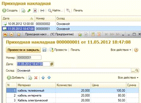 · документ «Приходная накладная»;