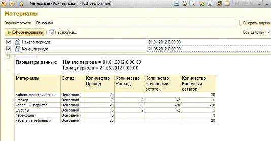 И при отладке в 1С Предприятие отчет «Материалы»