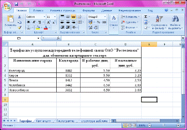 структуру шаблона таблицы "Тарифы на услуги междугородней телефонной связи