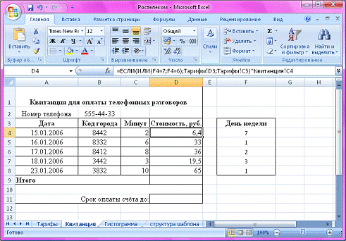 =ЕСЛИ (ИЛИ (F4=7; F4=6); Тарифы! D3; Тарифы! C3) *Квитанция!
