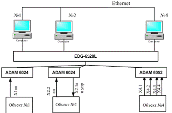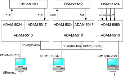 . Структурная схема распределённой су на базе контроллеров Adam-5510 и Adam-5510/tcp