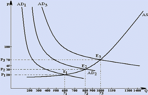 кривая совокупного предложения; AD1, AD2, AD3 - кривые совокупного спроса.