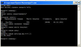 предыдущих, затем выводит место покупки, товар, цену и дату покупки. Входной